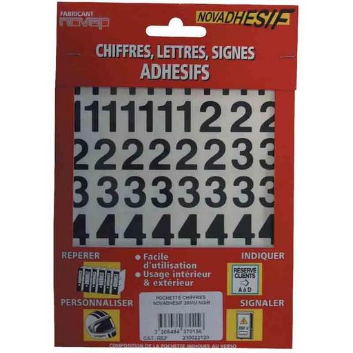 Utilisation intérieur / extérieur. Adhérent sur la plupart des matériaux. Pochette chiffres 30 mm comprenant : 8 (1), 5 (2,3,4,0), 7 (5), 4 (6,7,8,9). Pochette chiffres 40 mm comprenant : 6 (1), 3 (2,6), 2 (3,4,7,8,9), 4 (5,0).Caractéristiques générales : Dim. (mm) : 40Couleur : NoirMarque: Nova