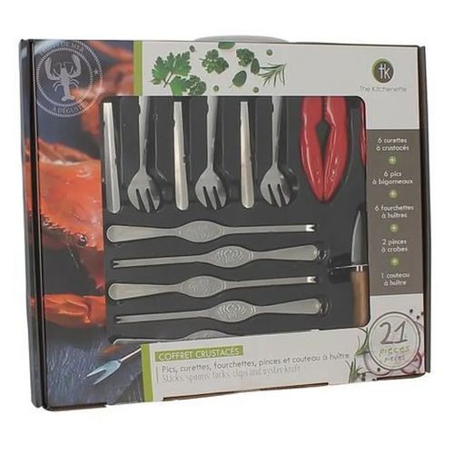Set de 21 pièces, idéal pour déguster facilement tous types de crustacés. Allié idéal pour vos repas de fêtes, il se compose de 6 pics à bigorneaux, de 6 curettes à crustacés, de 6 fourchettes à huîtres, de 2 pinces à crabes et d' 1 couteau à huîtres.