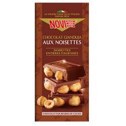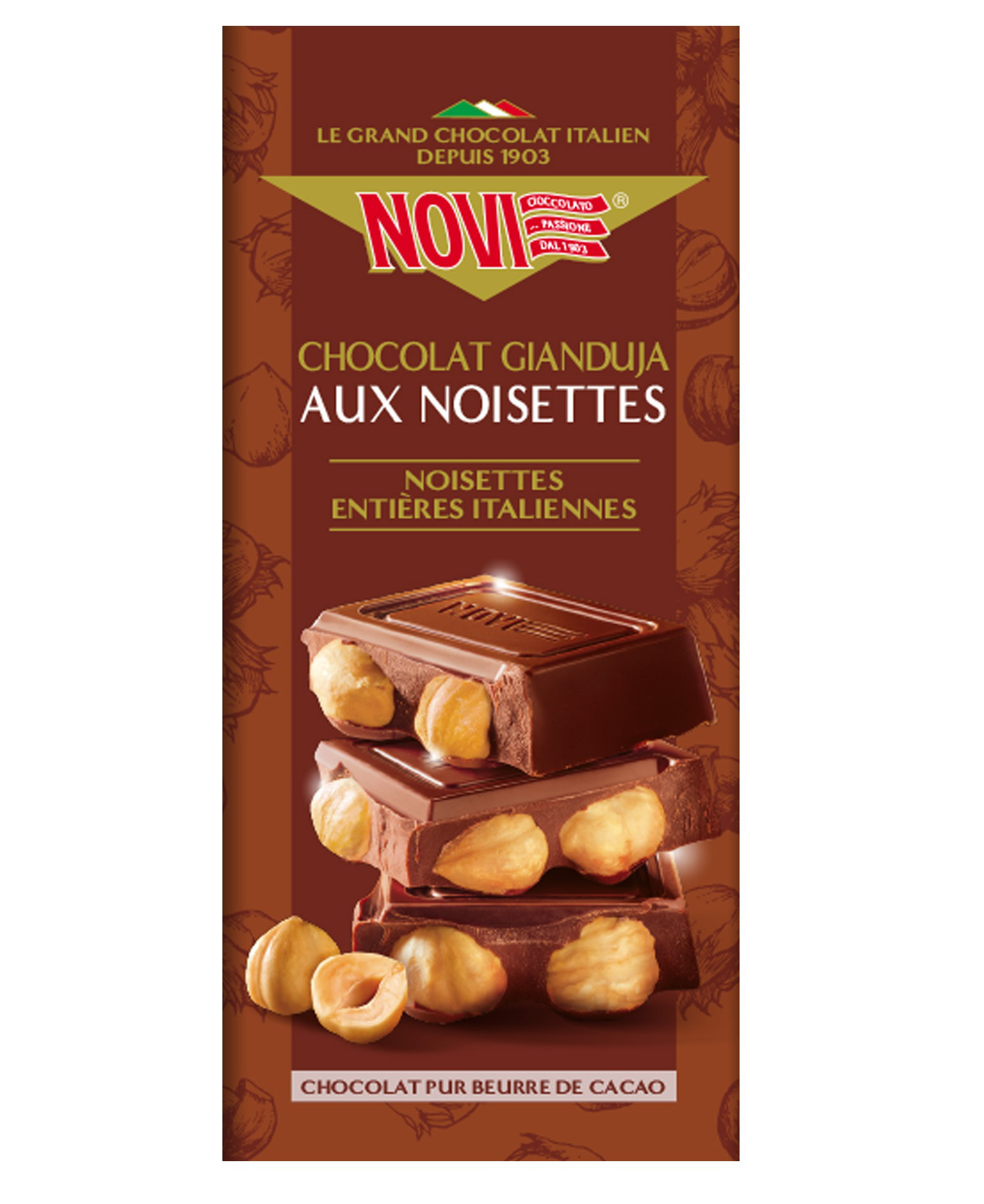 Les célèbres noisettes des collines italiennes, produit d'excellence de notre terroir, rencontrent le classique Chocolat Gianduja. Cest ainsi que nait, dans notre usine en Piémont, le délicieux Chocolat Gianduja aux noisettes, la spécialité Novi unique et incomparable. NOVI LE GRAND CHOCOLAT ITALIEN