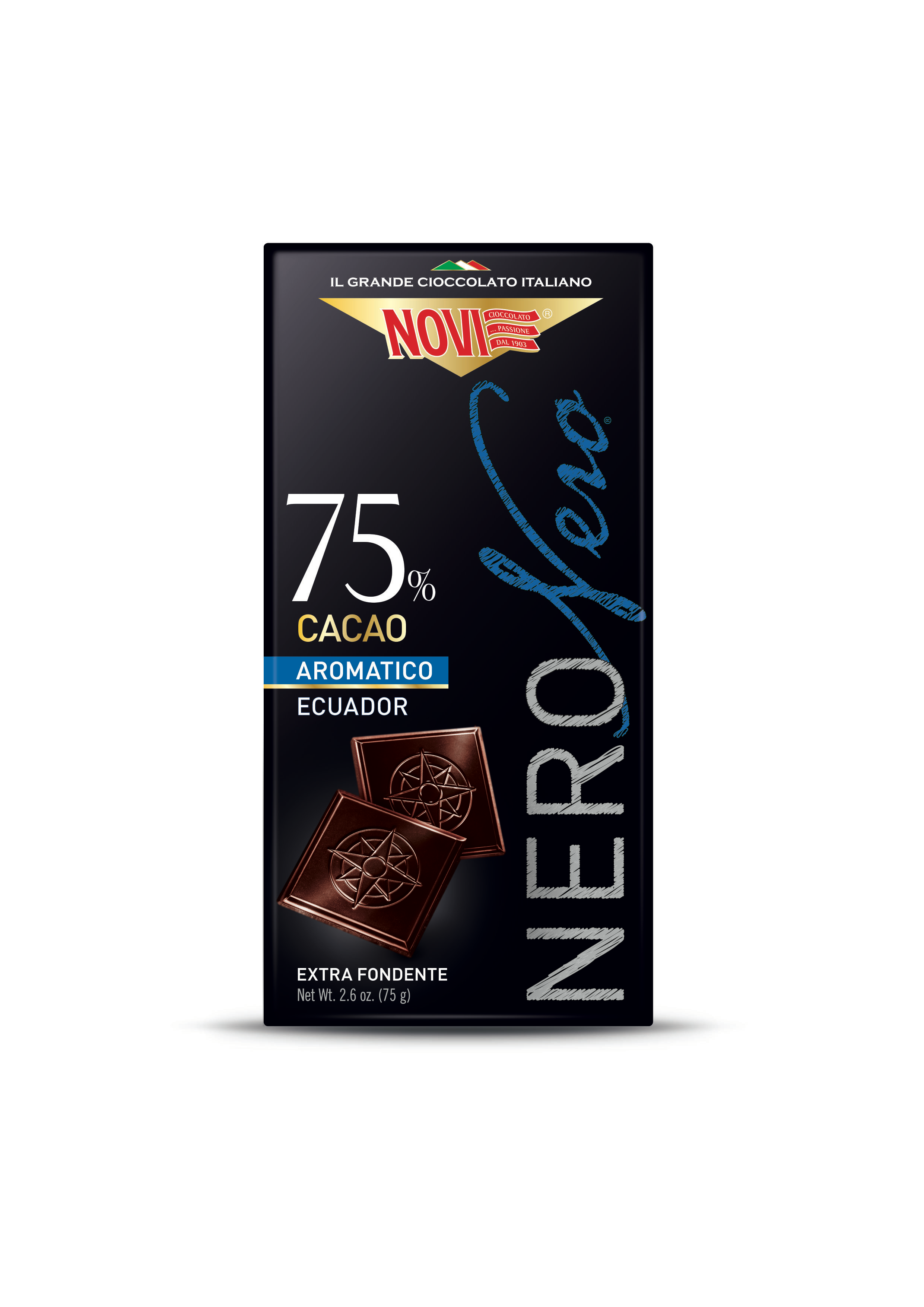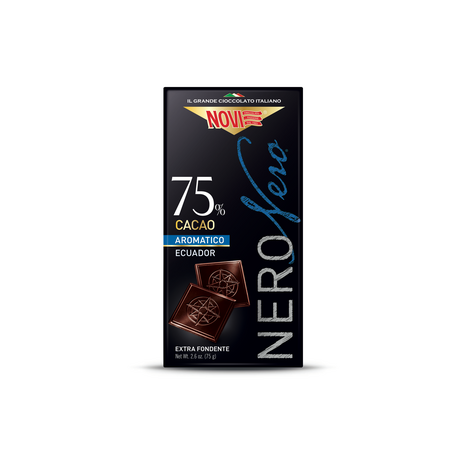 Nero Nero, une ligne de barres dans des étuis élégants, conçue pour ceux qui veulent goûter le chocolat noir Novi dans toutes ses nuances et variations. Un savant mélange de fines fèves de cacao, soigneusement torréfiées dans l'usine de Novi Ligure dans le Piémont, crée un chocolat à l'identité précieuse, dans lequel force et gentillesse s'expriment en totale harmonie.Avec un goût amer et délicat, Nero Nero se marie parfaitement avec votre temps libre, de l'après-repas à une parenthèse agréable et délicieuse.
