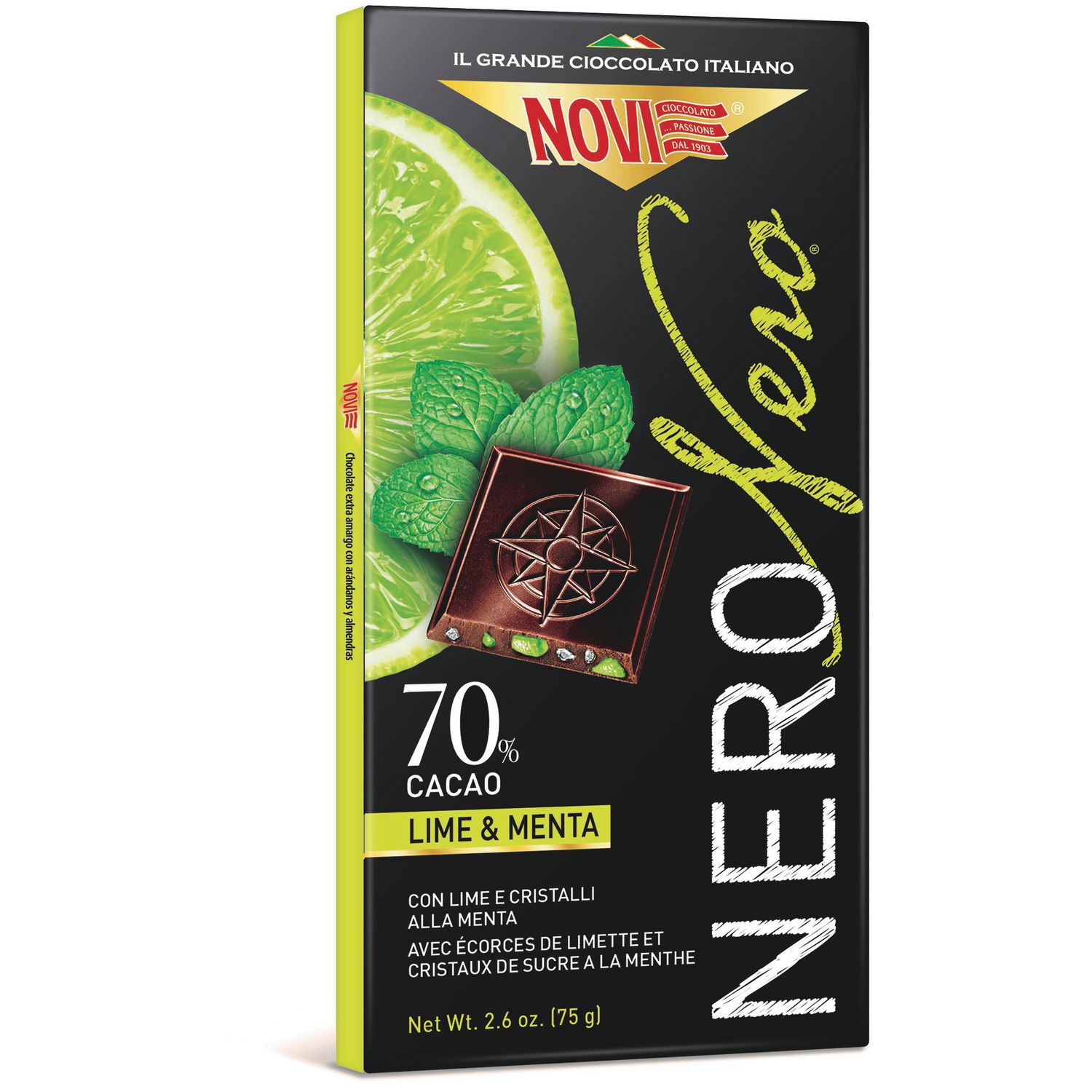 Nero Nero, une ligne de barres dans des étuis élégants, conçue pour ceux qui veulent goûter le chocolat noir Novi dans toutes ses nuances et variations. Un savant mélange de fines fèves de cacao, soigneusement torréfiées dans l'usine de Novi Ligure dans le Piémont, crée un chocolat à l'identité précieuse, dans lequel force et gentillesse s'expriment en totale harmonie.Avec un goût amer et délicat, Nero Nero se marie parfaitement avec votre temps libre, de l'après-repas à une parenthèse agréable et délicieuse.