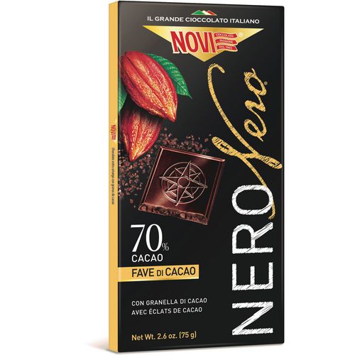 Nero Nero, une ligne de barres dans des étuis élégants, conçue pour ceux qui veulent goûter le chocolat noir Novi dans toutes ses nuances et variations. Un savant mélange de fines fèves de cacao, soigneusement torréfiées dans l'usine de Novi Ligure dans le Piémont, crée un chocolat à l'identité précieuse, dans lequel force et gentillesse s'expriment en totale harmonie.Avec un goût amer et délicat, Nero Nero se marie parfaitement avec votre temps libre, de l'après-repas à une parenthèse agréable et délicieuse.