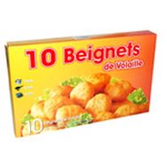 Preparation a base de viande de poulet traitee en salaison 60%, enrobee d'une pate a beignet 40%, frite et cuite.