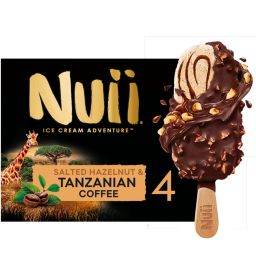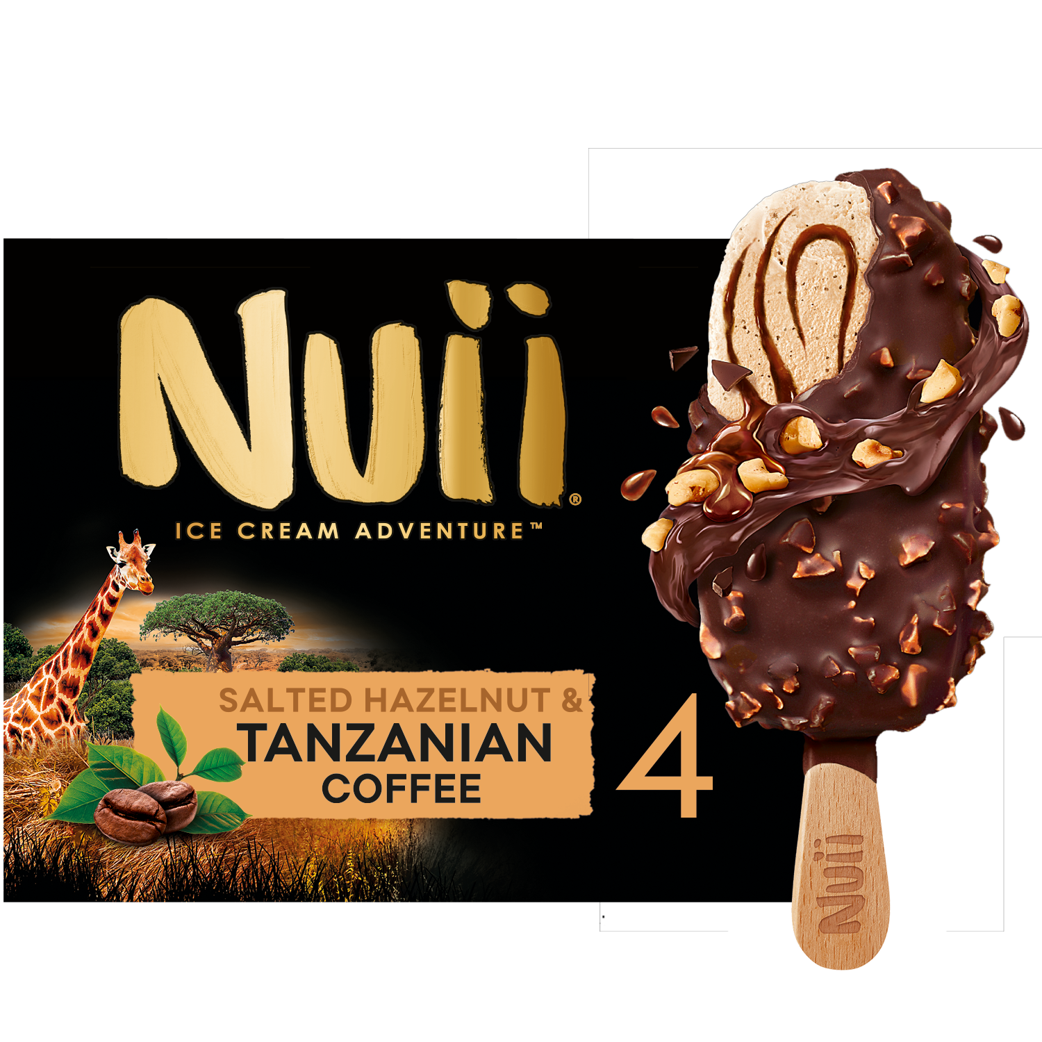 « Découvrez NUII, une aventure gourmande, empreinte d’évasion. Laissez-vous tenter par la saveur unique des grains de café de Tanzanie, associé à une onctueuse crème glacée marbrée d’une sauce au chocolat. Le tout est enrobé de chocolat noir craquant et de délicieuses noisettes grillées & salées. Une aventure au goût unique ! Chocolat certifié UTZ. Recette sans gluten. Convient aux végétariens.» Crème glacée au café de Tanzanie avec des grains de café torréfié de Tanzanie (0.4%) et une sauce au chocolat (5%) enrobés de chocolat noir (32%) et de morceaux de noisettes salés grillés (4.5%).