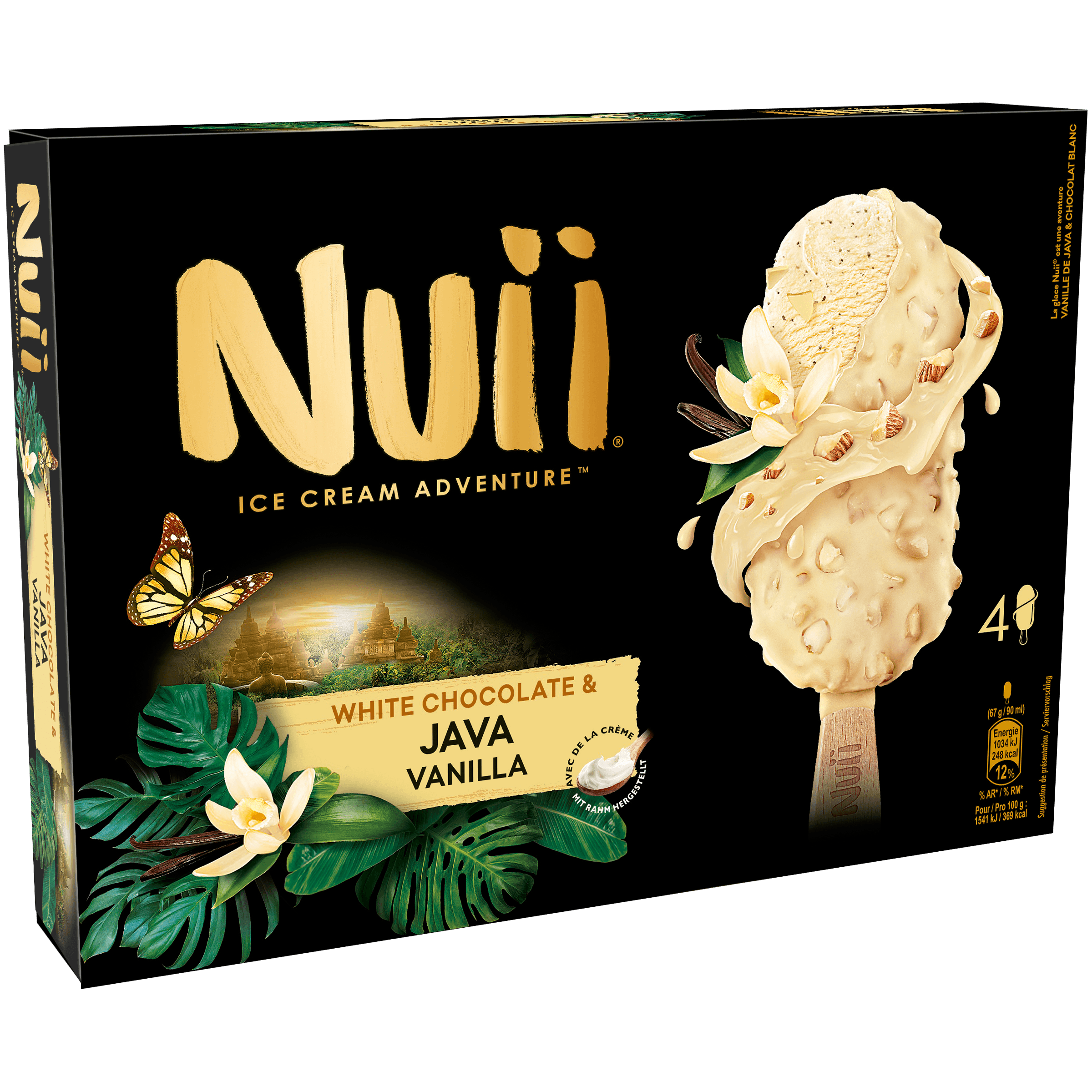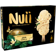 Crème glacée à la vanille de Java, enrobée de chocolat blanc (33%) et morceaux d'amandes grillées (5.5%).
