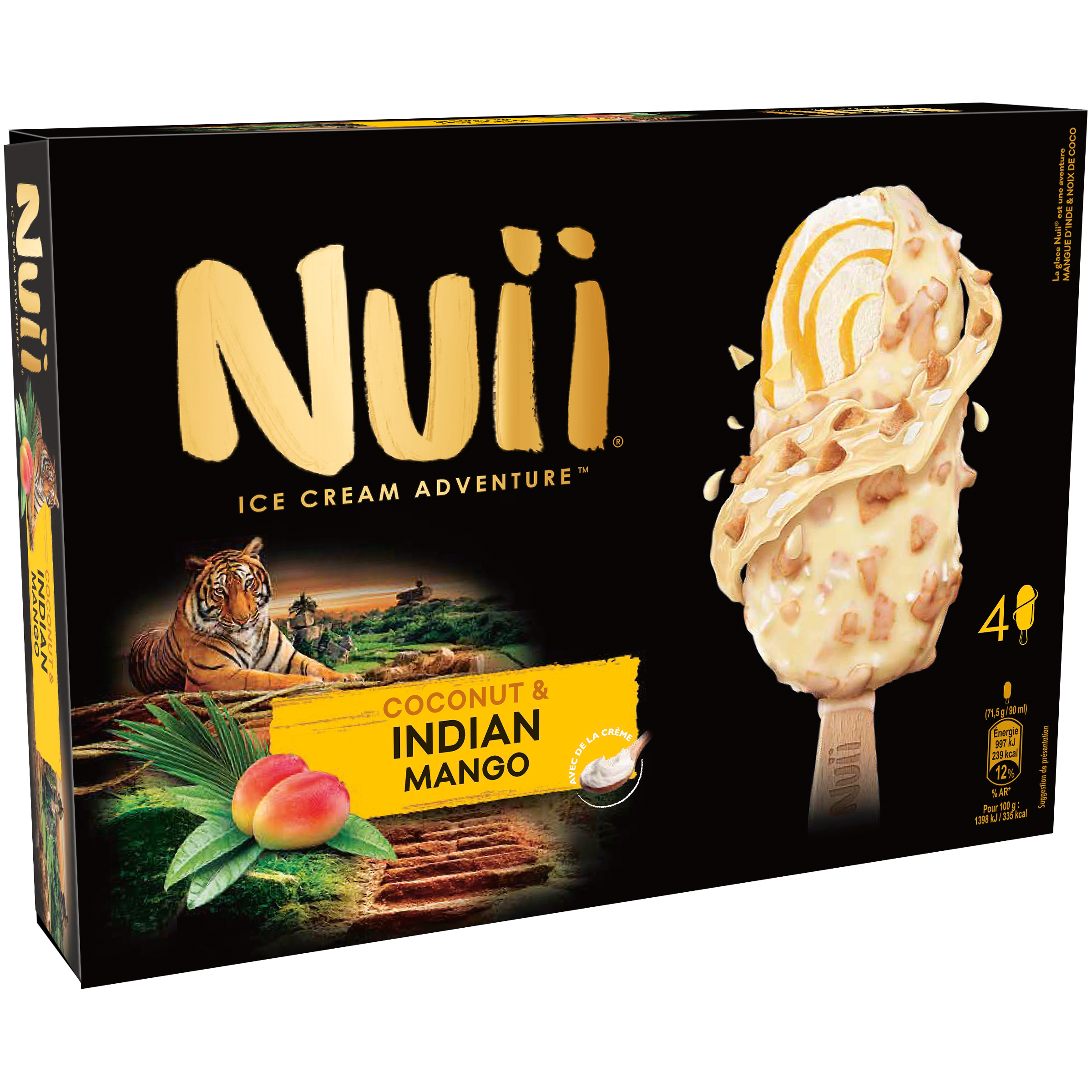 Découvrez NUII, une aventure gourmande, empreinte d'évasion. Partez en Inde avec ce batônnet exotique composé d'une onctueuse crème glacée à la noix de coco marbrée d'un sorbet à la mangue d'Inde. Son goût unique se révèle sous son enrobage de chocolat blanc craquant et ses généreux morceaux de noix de coco. Une saveur irrésistible à explorer ! Chocolat certifié Rainforest Alliance. Recette sans gluten. Convient aux végétariens.