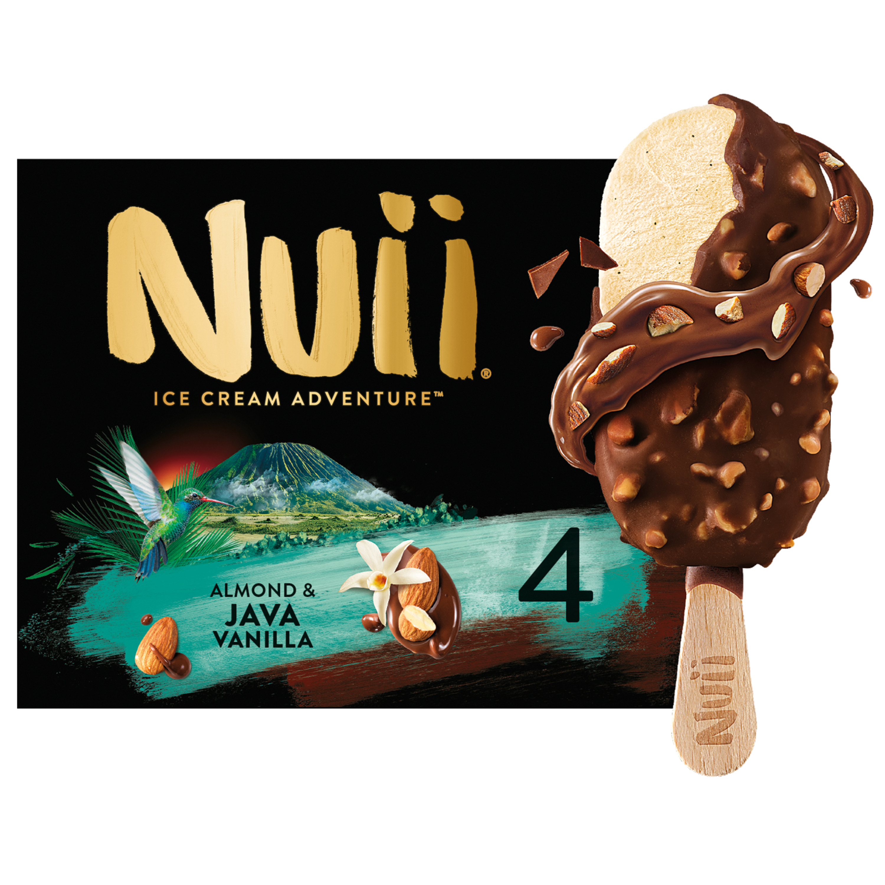 Découvrez NUII, une aventure gourmande, empreinte d'évasion. Réputée pour sa saveur exotique et son goût subtilement fumé, laissez-vous tenter par délicatesse de la vanille de Java. Mélangée à une onctueuse crème glacée, son goût unique se révèle sous une couche de chocolat au lait craquant et de généreux éclats d'amandes. Une alliance irrésistible à explorer… Chocolat certifié Rainforest Alliance. Recette sans gluten.