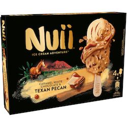 Découvrez NUII, une aventure gourmande, empreinte d'évasion. Succombez à la saveur unique des noix de pécan du Texas mélangées à un délicieux enrobage de chocolat blanc caramélisé qui recouvrent une onctueuse crème glacée marbrée d'une sauce au caramel malté. Une aventure au goût unique ! Chocolat certifié Rainforest Alliance. Convient aux végétariens.