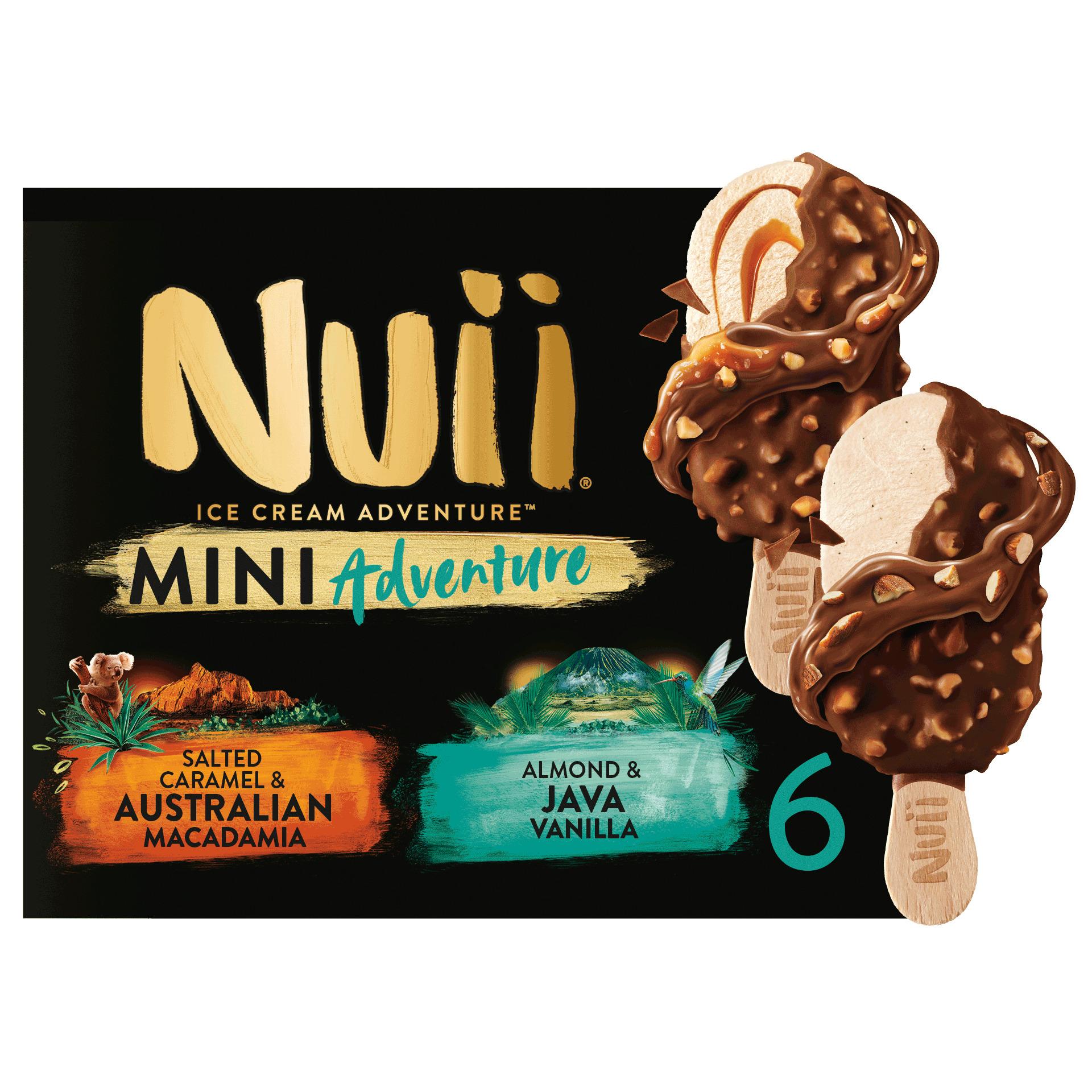 NUII Mini Australian Macadamia : Crème glacée à la vanille et sauce caramel salé (5,5%) avec un enrobage de chocolat au lait (34%) et des morceaux de noix de Macadamia d'Australie caramélisées / Java Vanilla : Crème glacée à la vanille de Java avec un enrobage de chocolat au lait (35%) et des morceaux d'amandes grillées (5,5%) x6