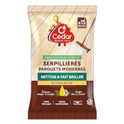 Les serpillières O'CEDAR Parquets Modernes sont fabriquées en France avec des fibres d'origine végétale et issues de forêts bien gérées certifiées FSC® et d'autres sources contrôlées. Formulées à base de savon d'huile de lin, elles sont fortement imprégnées et vous permettent de nettoyer et faire briller vos parquets vitrifiés et stratifiés sans frotter. Les serpillières offrent un agréable parfum Bois de Santal et s'adaptent à tous les types de balais (balais brosses et balais dépoussiérants).