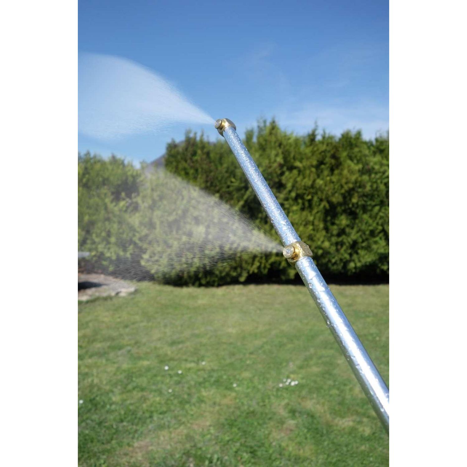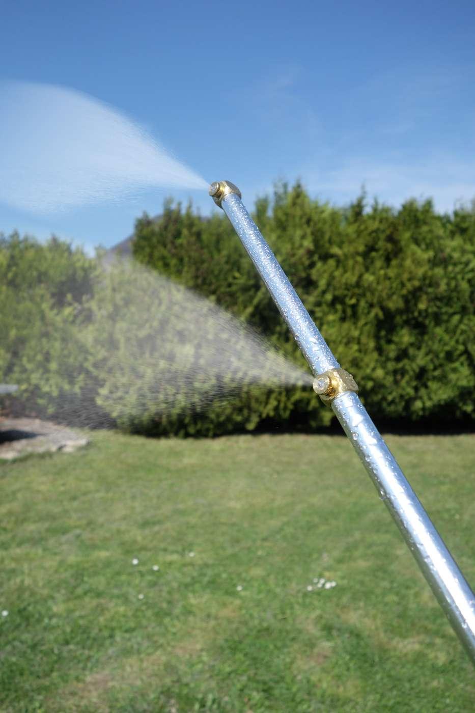 Rampe de brumisation nomade 2 en 1- Se branche directement sur le tuyau d'arrosage- Construction en aluminium- Tête rotative orientable à 360°- Hauteur ajustable de 150 à 205 cm- Robinet ouvert/fermé intégré- 5 buses 100% laiton haute qualité- Pieds lestés pour une parfaite stabilité- Livré avec pom