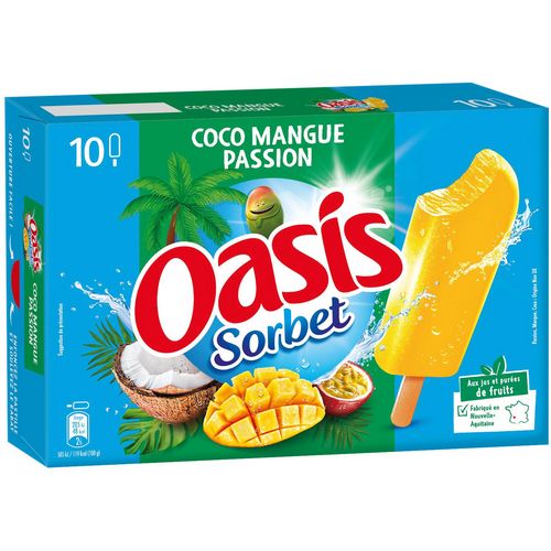 Profitez d'une expérience rafraîchissante et fruitée avec les bâtonnets Oasis Sorbet: un délicieux sorbet Coco Mangue Passion au bon goût de fruits pour une dégustation 100% plaisir, 100% fraicheur.