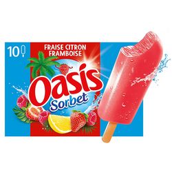 Profitez d'une expérience rafraîchissante et fruitée avec les bâtonnets Oasis Sorbet: un délicieux sorbet Tropical au bon goût de fruits pour une dégustation 100% plaisir, 100% fraicheur.