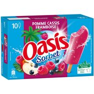 Profitez d'une expérience rafraîchissante et fruitée avec les bâtonnets Oasis Sorbet: un délicieux sorbet Pomme Cassis Framboise au bon goût de fruits pour une dégustation 100% plaisir, 100% fraicheur.