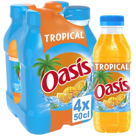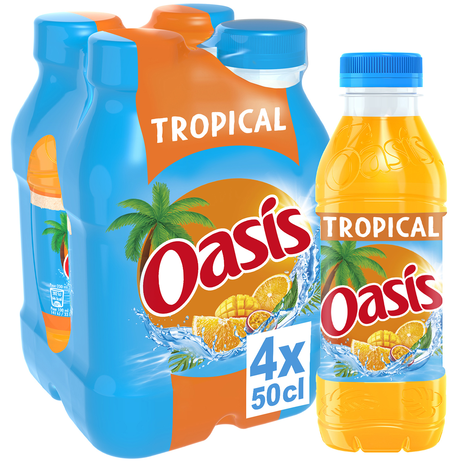 Oasis Tropical, la boisson ultra rafraîchissante au bon goût de fruits tropicaux. Une recette unique sans arôme artificiel et sans colorant artificiel, pour un moment de plaisir et de fun en famille ou entre amis !