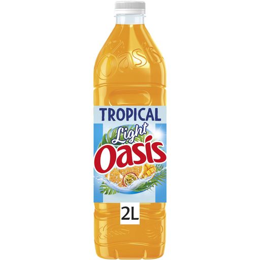 Oasis Tropical Light, tout le bon gout de fruits exotiques d’Oasis Tropical, sans sucre ajouté* et sans conservateur ni colorant artificiel. *Contient le sucre naturellement présent dans les fruits Boisson rafraîchissante aux fruits aromatisée, avec édulcorants.