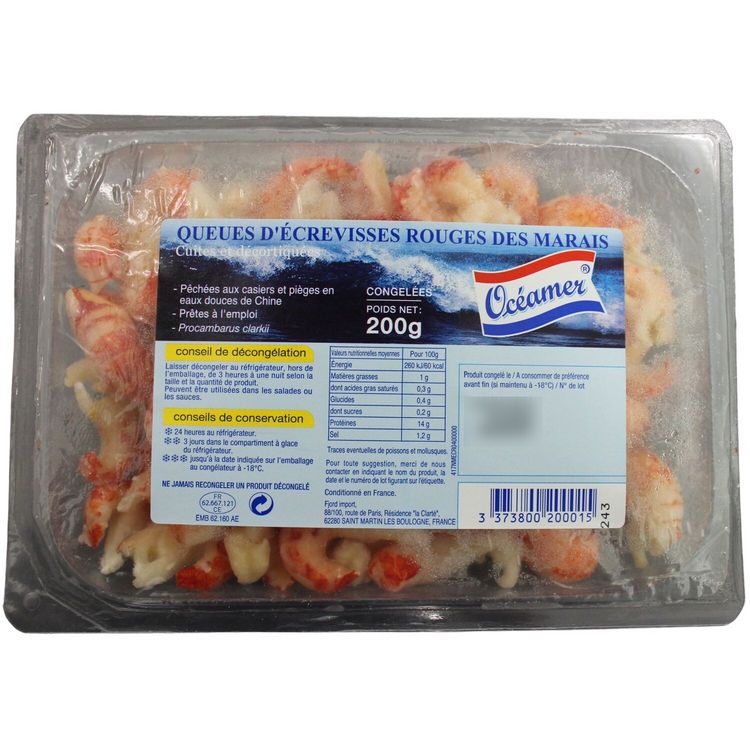 QUEUES D'ECREVISSES ROUGES DES MARAIS CUITES DECORTIQUEES CONGELEES - BARQUETTES DE 200g