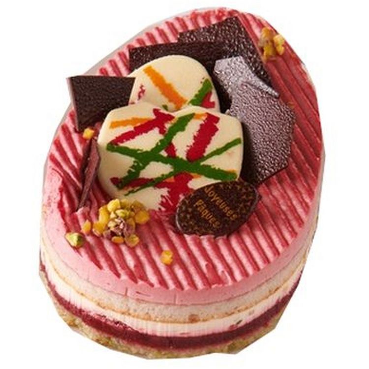 Entremet œufs framboise nougat 94,8% (CREME UHT (CREME, stabilisant : E407), sucre, purée de framboise 17,01%, eau, blanc d'OEUF, farine de BLE, poudre d'AMANDE, sucre glace (sucre, amidon), sirop de glucose, crème de nougat de Montélimar 1,9% (AMANDES, sucre, sirop de glucose, miel, pain azyme (fécule de pomme de terre, eau, huile d'olive), albumine d'OEUF, arôme naturel de vanille), PISTACHE en poudre 1,01%, chocolat blanc (sucre, beurre de cacao, poudre de LAIT entier, émulsifiant : lécithine de SOJA, arôme naturel de vanille), AMANDES hachées 0,79%, purée de cassis noir de bourgogne, gélifiant (E440i, saccharose), PISTACHE verte hachée 0,32%, miel 0,32%, amidon de maïs, poudre de blanc d'OEUF (blanc d'OEUF, agent moussant : E1505), arôme naturel de framboise (dont correcteur d'acidité : E270), épaississant : E410, jaune d'OEUF, préparation concentré de citron (concentré de jus de citron, correcteur d'acidité : E330, huile essentielle de citron), gélifiant (E440i, dextrose), concentré de carthame et de citron, gélifiant : E406, arôme naturel, concentré de radis, de pomme et de cassis, concentré de spiruline, acidifiant : E330), décor chocolat (chocolat blanc (sucre, beurre de cacao, LAIT entier en poudre, émusilfiant : lécithine de SOJA, arôme naturel de vanille), poudre de cacao colorants : concentré de radis, de cassis, de pomme, de carthane et de spiruline, E153), chocolat noir (masse de cacao, sucre, beurre de cacao, emulsifiant : lecithine de SOJA, arome naturel de vanille), chocolat blanc et amber, chocolat lait (sucre, beurre de cacao, LAIT entier en poudre, masse de cacao, emulsifiant : lecithine de SOJA, arome naturel de vanille), PISTACHE hachée 1,1%, décors chocolat noir (masse de cacao, sucre, beurre de cacao, emulsifiant : lecithine de SOJA, arome naturel de vanille amidon de mais, colorant : E100).