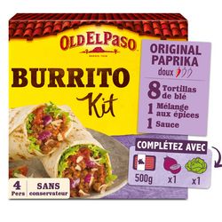 Découvrez le Kit Buritos Original paprika doux Old El Paso™, idéal pour 4 personnes, prêt en 15 minutes et sans conservateur. Le kit est composé de 8 tortillas de blé moelleuses (galettes), d'un mélange aux épices et d'une sauce salsa à la tomate à napper. Réalisez vos fajitas en complétant avec 500g de boeuf haché, un oignon ainsi que de la salade croquante ! Idées recettes : rendez-vous sur notre site internet oldelpaso.fr. Accompagnez vos repas inspirés de la cuisine mexicaine avec des Tortilla Nachips Old El Paso™ et laissez-vous tenter par le Guacamole Old El Paso™, idéal pour l'apéritif ! Astuce : remplacez la viande par votre équivalent végétarien préféré ! Et n'oubliez pas, Vendredi c'est Fajitas Party !
