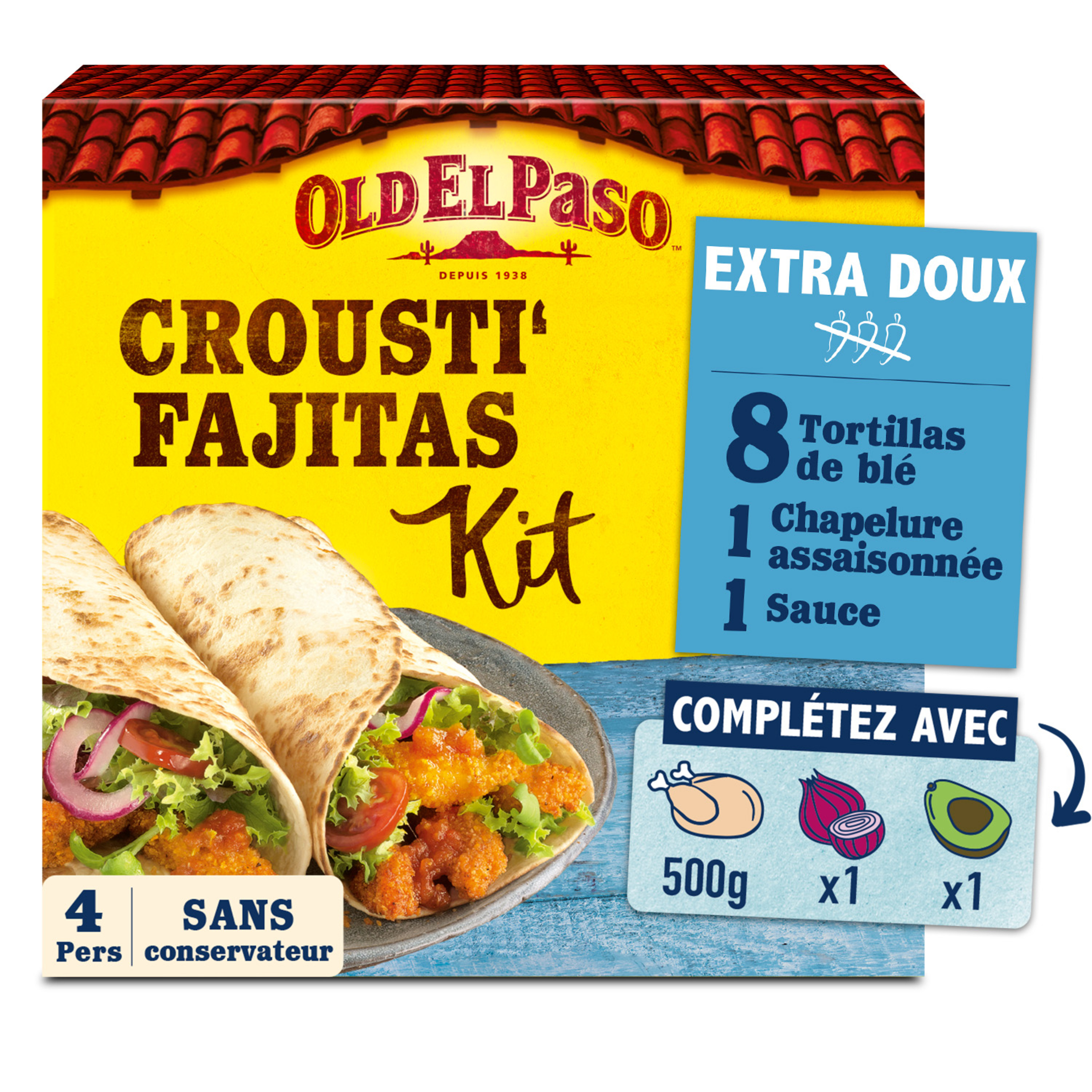 Découvrez le Kit Crousti' Fajita Extra Doux Old El Paso™, idéal pour 4 personnes, prêt en 20 minutes et sans conservateur. Le kit est composé de 8 tortillas de blé moelleuses (galettes), d'une chapelure assaisonnée, d'une sauce à napper et d'un sac shaker. Réalisez vos fajitas en complétant avec 500g de poulet, un oignon rouge, un avocat ainsi que des tomates cerises ! Idées recettes : rendez-vous sur notre site internet oldelpaso.fr. Accompagnez vos repas inspirés de la cuisine mexicaine avec des Tortilla Nachips Old El Paso™ et laissez-vous tenter par le Guacamole Old El Paso™, idéal pour l'apéritif ! Astuce : remplacez la viande par votre équivalent végétarien préféré ! Et n'oubliez pas, Vendredi c'est Fajitas Party !