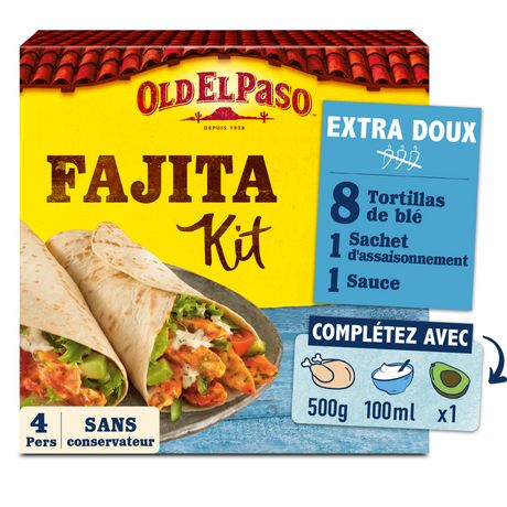 Découvrez le Kit Fajita Extra doux Old El Paso™, idéal pour 4 personnes, prêt en 20 minutes et sans conservateur. Le kit est composé de 8 tortillas de blé moelleuses (galettes), d'une sauce à cuisiner et d'un sachet d'assaisonnement. Réalisez vos fajitas en complétant avec 500g de poulet, 100 mL de crème fraiche, un avocat ainsi que de la salade croquante ! Idées recettes : rendez-vous sur notre site internet oldelpaso.fr. Accompagnez vos repas inspirés de la cuisine mexicaine avec des Tortilla Nachips Old El Paso™ et laissez-vous tenter par le Guacamole Old El Paso™, idéal pour l'apéritif ! Astuce : remplacez la viande par votre équivalent végétarien préféré ! Et n'oubliez pas, Vendredi c'est Fajitas Party !