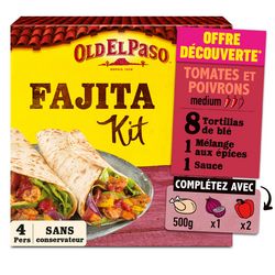 Découvrez le Kit Fajita Tomates et Poivrons Old El Paso™ Offre Découverte, idéal pour 4 personnes, prêt en 15 minutes et sans conservateur. Le kit est composé de 8 tortillas de blé moelleuses (galettes), d'un mélange aux épices et d'une sauce salsa à la tomate à napper. Réalisez vos fajitas en complétant avec 500g de poulet, un oignon rouge, deux poivrons rouges ainsi que de la salade croquante ! Idées recettes : rendez-vous sur notre site internet oldelpaso.fr. Accompagnez vos repas inspirés de la cuisine mexicaine avec des Tortilla Nachips Old El Paso™ et laissez-vous tenter par le Guacamole Old El Paso™, idéal pour l'apéritif ! Astuce : remplacez la viande par votre équivalent végétarien préféré ! Et n'oubliez pas, Vendredi c'est Fajitas Party !