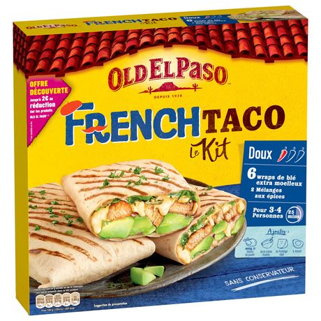Découvrez le Kit French Taco Old El Paso™ Offre Découverte, idéal pour 3 à 4 personnes, prêt en 25 minutes et sans conservateur. Le kit est composé de 6 wraps de blé (galettes) extra moelleux et de deux mélanges aux épices. Réalisez vos French Tacos en complétant avec 600g de blancs de poulet, 100g d'emmental, 120g de crème fraîche ainsi qu'un avocat. Vous pouvez également ajouter un oignon rouge et de la mâche ! Idées recettes : rendez-vous sur notre site internet oldelpaso.fr. Accompagnez vos repas inspirés de la cuisine mexicaine avec des Tortilla Nachips Old El Paso™ et laissez-vous tenter par le Guacamole Old El Paso™, idéal pour l'apéritif ! Astuce : remplacez la viande par votre équivalent végétarien préféré ! Et n'oubliez pas, Vendredi c'est Fajitas Party !
