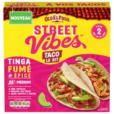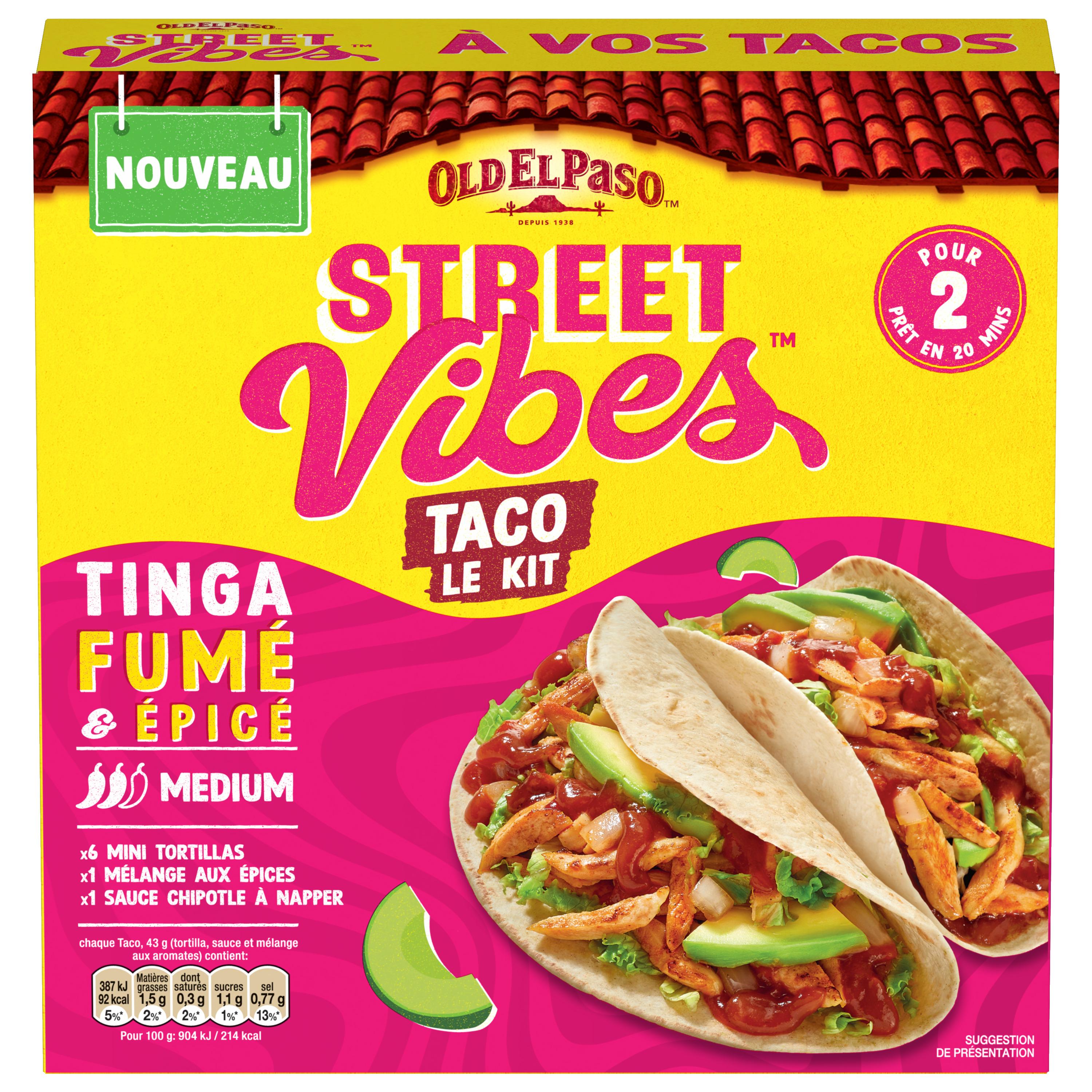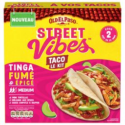 Découvrez le Kit Street Vibes Taco Tinga Fumé et Epicé Old El Paso™, idéal pour 2 personnes, prêt en 20 minutes et sans conservateur. Le kit est composé de 6 mini tortillas de blé moelleuses (galettes), d'un mélange aux épices et d'une sauce chipotle à napper. Réalisez vos tacos en complétant avec 250g de filet de poulet, un petit oignon jaune, un avocat ainsi que quelques feuilles de salade ! Idées recettes : rendez-vous sur notre site internet oldelpaso.fr. Accompagnez vos repas inspirés de la cuisine mexicaine avec des Tortilla Nachips Old El Paso™ et laissez-vous tenter par le Guacamole Old El Paso™, idéal pour l'apéritif ! Astuce : remplacez la viande par votre équivalent végétarien préféré ! Et n'oubliez pas, Vendredi c'est Fajitas Party !