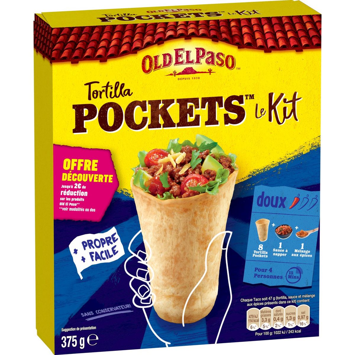 Découvrez le Kit Tortilla Pocket™ Original doux Old El Paso™ Offre Découverte, idéal pour 4 personnes, prêt en 15 minutes et sans conservateur. Le kit est composé de 8 tortillas de blé Pocket™ moelleuses (galettes), d'un mélange aux épices et d'une sauce salsa à la tomate à napper. Réalisez vos burritos en complétant avec 500g de boeuf haché, un oignon ainsi que des tomates cerises et de la salade croquante ! Idées recettes : rendez-vous sur notre site internet oldelpaso.fr. Accompagnez vos repas inspirés de la cuisine mexicaine avec des Tortilla Nachips Old El Paso™ et laissez-vous tenter par le Guacamole Old El Paso™, idéal pour l'apéritif ! Astuce : remplacez la viande par votre équivalent végétarien préféré ! Et n'oubliez pas, Vendredi c'est Fajitas Party !