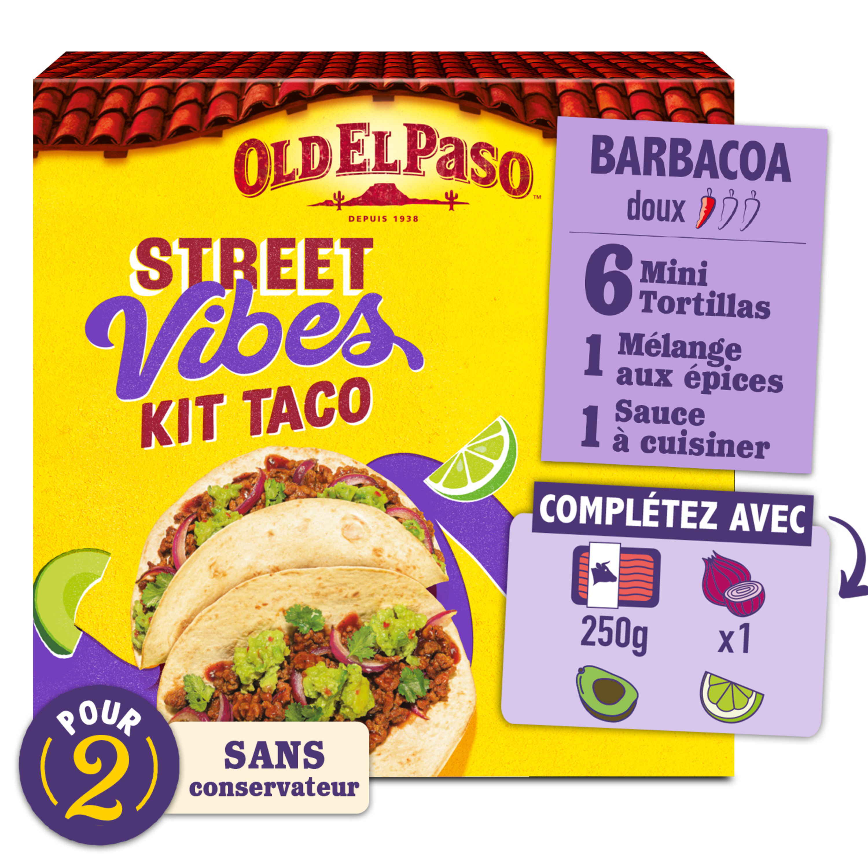 Découvrez le Kit Steet Vibes Taco Barbacoa Barbecue Old El Paso™, idéal pour 2 personnes, prêt en 20 minutes et sans conservateur. Le kit est composé de 6 mini tortillas de blé moelleuses (galettes), d'un mélange aux épices pour guacamole et d'une sauce barbecue à cuisiner. Réalisez vos tacos en complétant avec 250g de boeuf émincé, un petit oignon rouge, un avocat ainsi qu'un citron vert et de la coriande fraîche ! Idées recettes : rendez-vous sur notre site internet oldelpaso.fr. Accompagnez vos repas inspirés de la cuisine mexicaine avec des Tortilla Nachips Old El Paso™ et laissez-vous tenter par le Guacamole Old El Paso™, idéal pour l'apéritif ! Astuce : remplacez la viande par votre équivalent végétarien préféré ! Et n'oubliez pas, Vendredi c'est Fajitas Party !