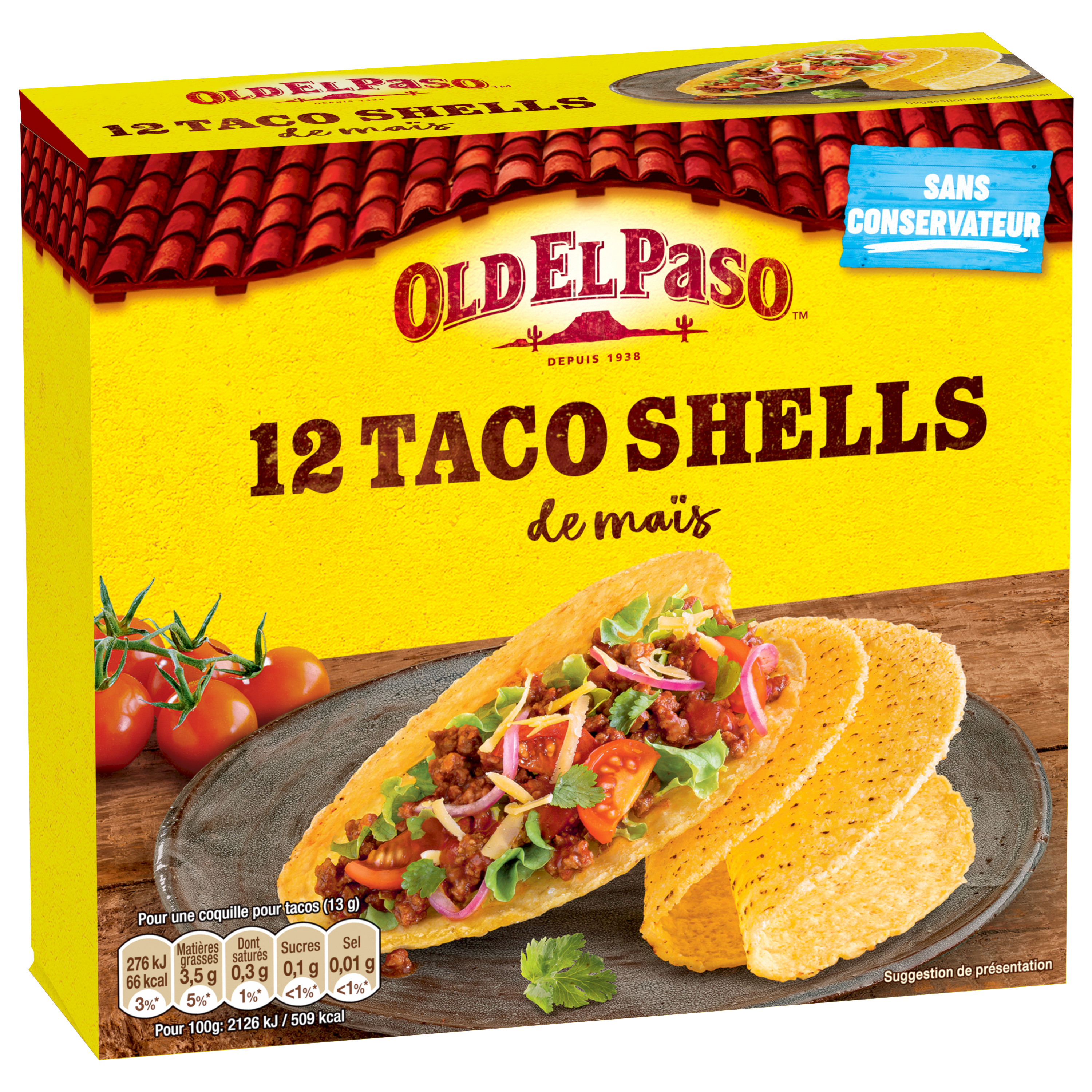 Les 12 Taco Shells Old El Paso™ (galettes) sont croustillants et sans conservateur. Découvrez-les au sein de la gamme Tortillas et Wraps Old El Paso™ et créez de délicieux tacos. Poulet, bœuf, légumes croquants, guacamole ou Sauce Salsa Original Old El Paso™ : garnissez ces taco shells de vos ingrédients préférés ! Pour plus d'idées recettes, rendez-vous sur notre site internet oldelpaso.fr. Accompagnez vos repas inspirés de la cuisine mexicaine avec des Tortilla Nachips Old El Paso™ et laissez-vous tenter par le Guacamole Old El Paso™, idéal pour l'apéritif ! Et n'oubliez pas, Vendredi c'est Fajitas Party !