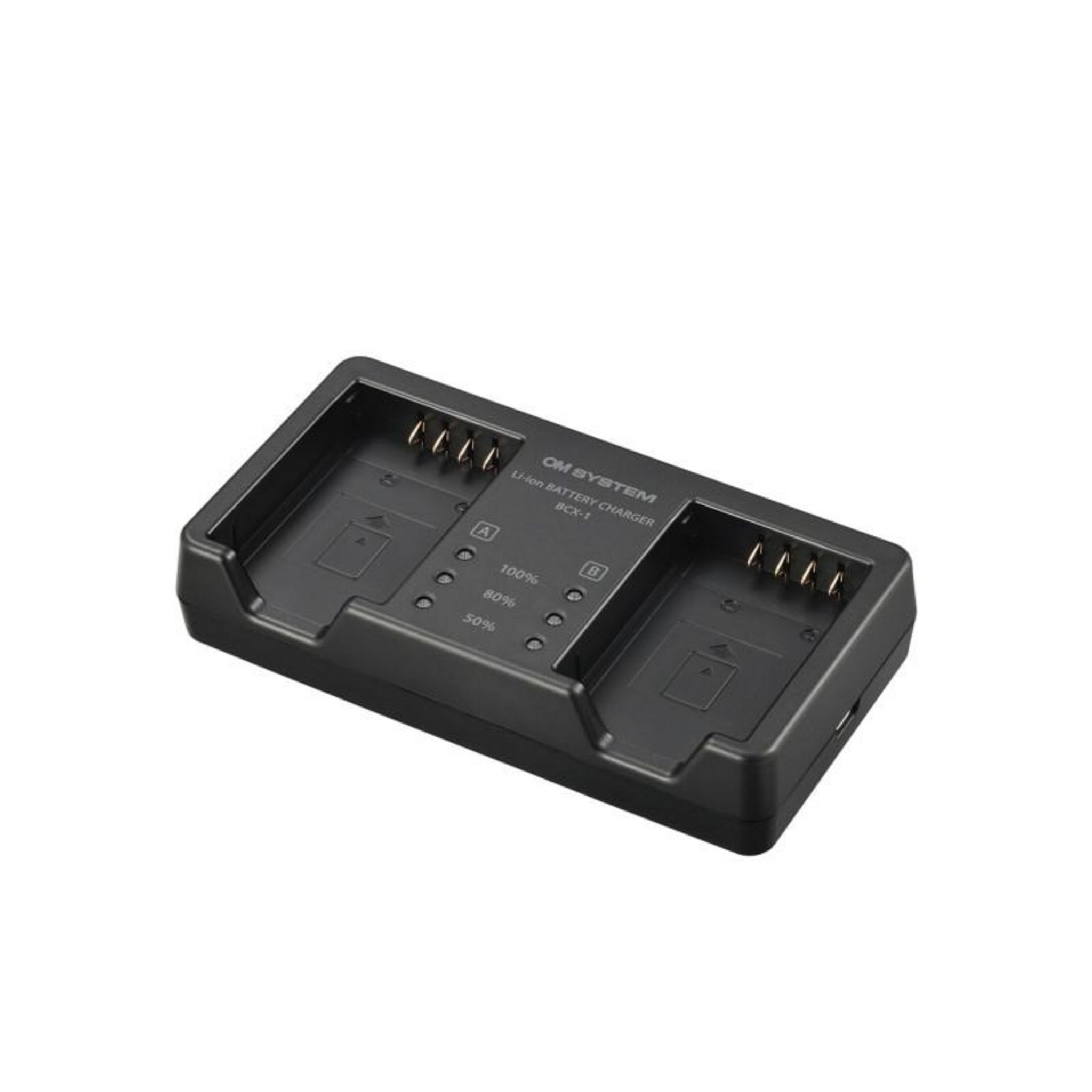 Le chargeur BCX-1 de la marque OM System est conçu spécifiquement pour les batteries BLX-1 utilisées dans l'appareil photo OM-1. Ce chargeur double permet de recharger simultanément deux batteries, offrant ainsi une grande flexibilité et rapidité, avec un temps de charge complet d'environ 150 minutes. Il est équipé d'un port USB-C, ce qui facilite l'alimentation via un adaptateur secteur ou une batterie portable compatible Power Delivery 3.0.
