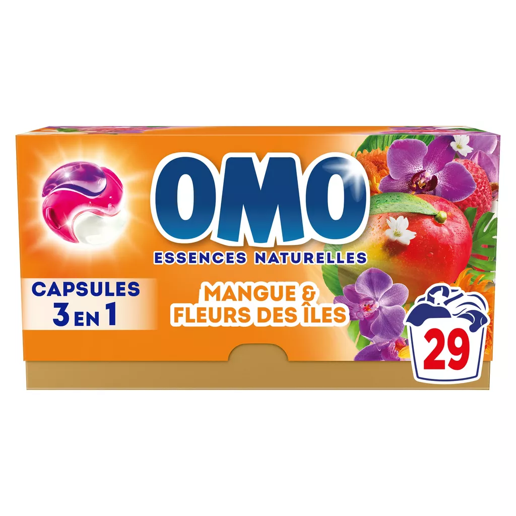 Nouvelle lessive capsules 3 en 1 OMO Mangue & Fleurs des îles 29 Lavages pour une fraîcheur intense et un parfum fabuleux toute la journée¹.