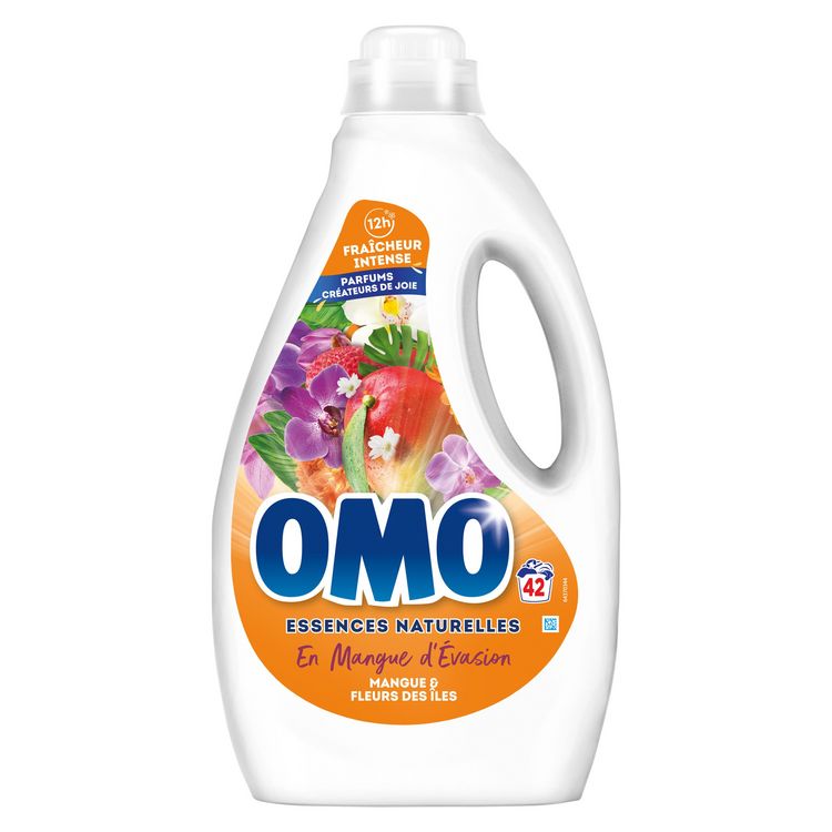 Découvrez la lessive liquide OMO Mangue & Fleurs des îles 42 Lavages pour une fraîcheur intense et un parfum fabuleux toute la journée. Embarquez pour un voyage tropical avec le parfum* En Mangue d'Évasion aux essences naturelles. Ses notes fruitées de Mangue et de Fleurs des îles sont source de joie et d'exotisme tout au long de la journée. La lessive liquide OMO se dissout instantanément et pénètre au cœur du linge pour une propreté éclatante. Sa formule testée dermatologiquement est idéale pour les peaux sensibles. De plus, sa bouteille est entièrement recyclable. Pensez à la recycler. Vous aimez ce parfum ? La lessive liquide OMO Mangue & Fleurs des îles est également disponible en format lessive capsules. Retrouvez toute la fraîcheur intense de OMO à travers une gamme de parfums créateurs de joie — Rose & Lilas Blanc, Jasmin & Fleur de Coton, Monoï, Lavande & Patchouli, Pivoine & Violette et Mangue & Fleurs des îles. La dose recommandée de lessive liquide OMO est de 42 ml pour une machine de 5 kg. Mais si votre linge est très sale ou que l'eau est dure dans votre région, rajoutez 15 ml. Pour laver à la main, diluez 20 ml de lessive dans 10 L d'eau. * Parfum de synthèse.