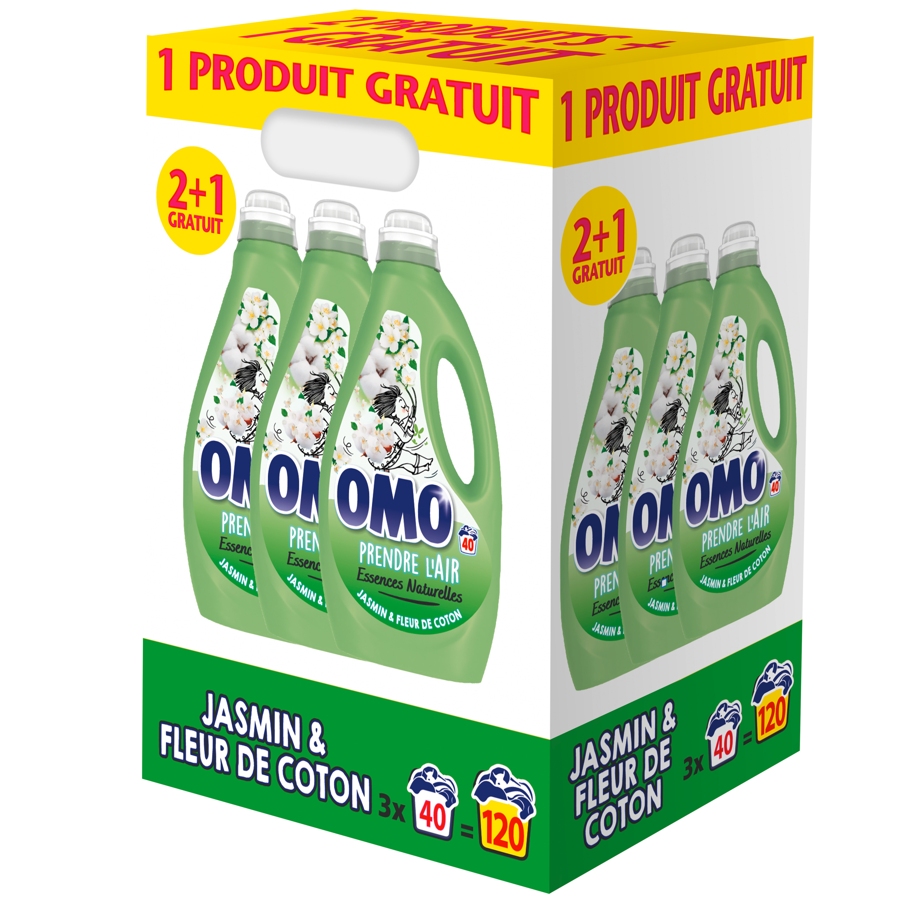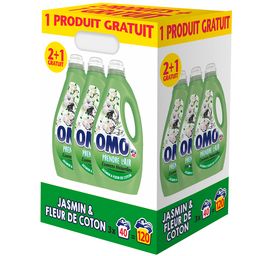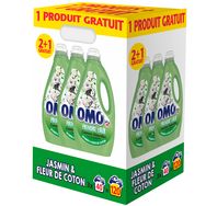 Découvrez la lessive liquide OMO Jasmin & Fleur de Coton aux essences naturelles.