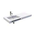 Plan vasque à suspendre collection LICEO, Design et douceur au toucher. Vasque moulée excentrée à gauche en Solid Surface - Livré avec bonde clic-clac en laiton et équerres de fixation en inox - Largeur 80cm - Finition Blanc mat