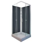 Cabine de douche MINEA, Choix de la couleur de finition. Montage avec silicone - Accès d'angle à portes coulissantes en verre trempé 5mm - 80x80x207,5cm - Profilés en aluminium blanc et panneaux de fond en verre trempé gris - Livrée en kit