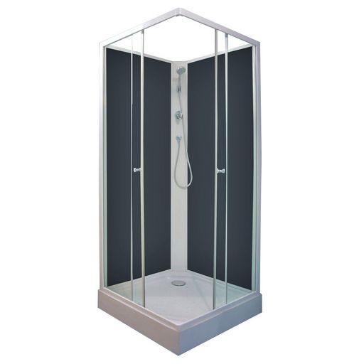 Livrées en kit, cette cabine se composent de parois fixe en verre trempé 4mm, d'un accès d'angle coulissant en verre trempé 5mm, d'une colonne en PVC blanc et de 2 panneaux latéraux en verre trempé gris 4mm.