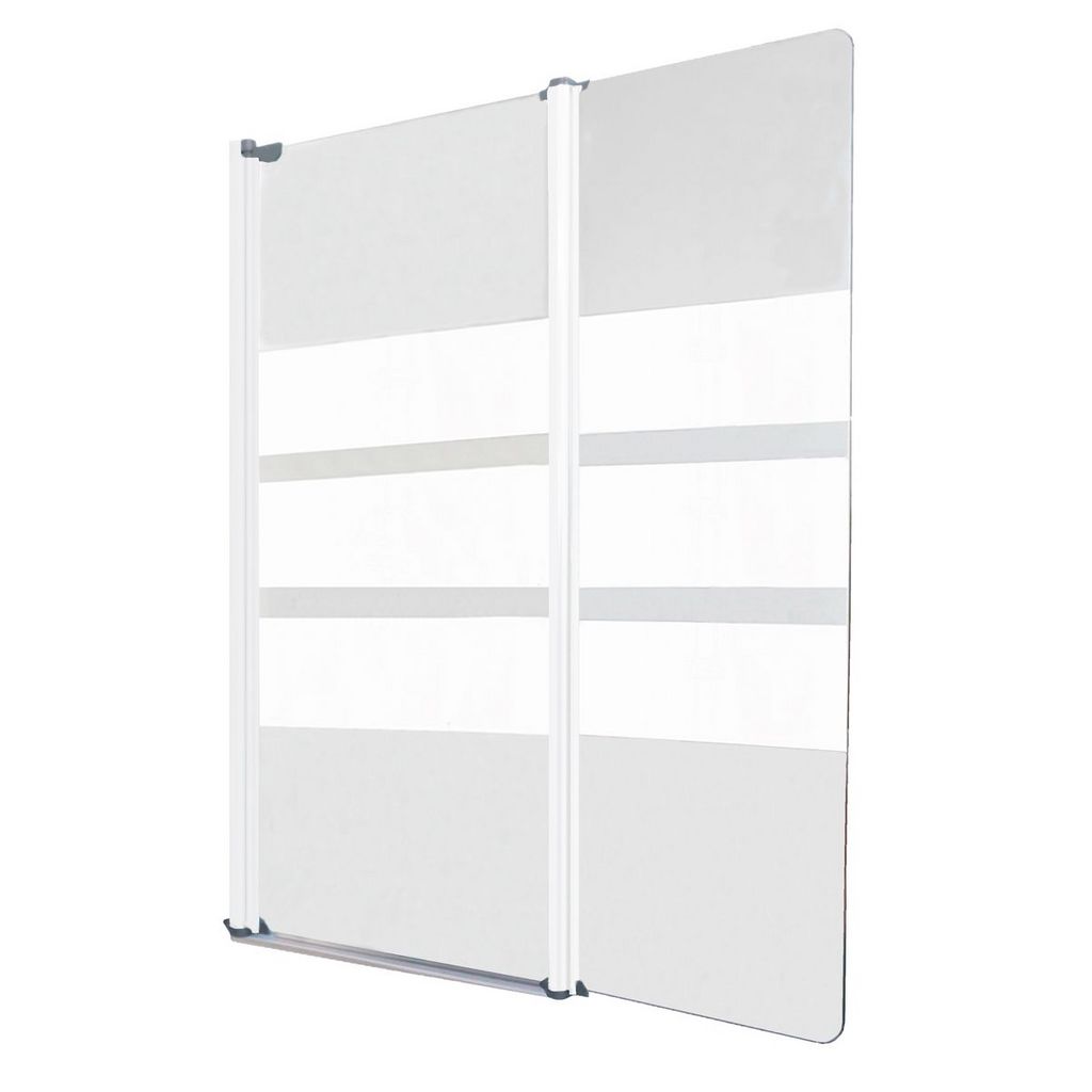 Pare-baignoire MISSI 2V, Sérigraphie 3 bandes blanche. 80x140cm - Epaisseur 4mm - Installation réversible - Profilé ajustable blanc (-5/+5mm) - Pivots en zinc - Verre trempé