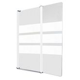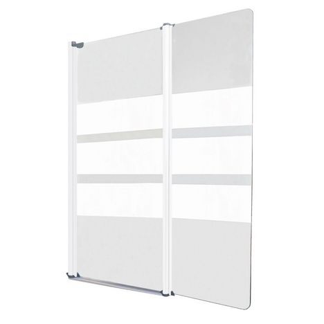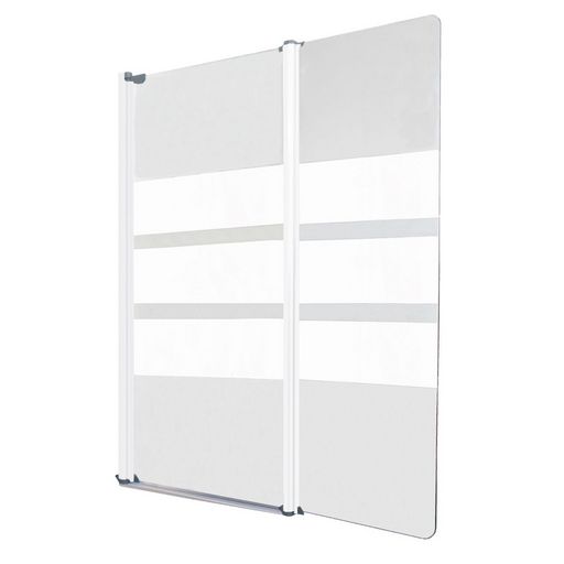 Cette paroi de 120x140cm se compose d'un volet de 80cm et d'un second volet de 40cm articulé. Elle est ornée d'une sérigraphie blanche positionnée en brise vue, ce décor se compose de 3 bandes. Son profilé en aluminium blanc est ajustable (+10mm).