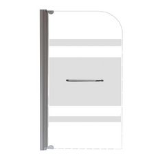 Cette paroi de 80x140cm finition chromé est ornée d'une sérigraphie dépolie positionnée en brise vue, ce décor dessine de 3 bandes. En son centre côté extérieur est fixé un porte serviette en inox chromé. Son profilé en aluminium chromé est ajustable (+2,5mm).