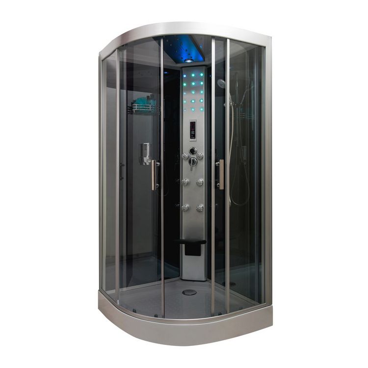 Cabine hydromassante SKADI, le bien-être par la chromothérapie. Montage sans silicone - Cabine d'angle 1/4 de cercle - 100x217cm - 6 buses massantes orientables - Siège relevable et étagère - Profilés Aluminium époxy gris - Livrée en kit