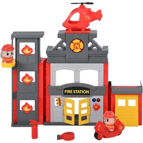 Une caserne robuste et astucieuse, conçue pour offrir des heures de jeu ! Avec un hélicoptère, une moto et deux figurines, les portes du garage s’ouvrent et les figurines montent sur l’ascenseur pour des missions pleines d’action. Les effets lumineux et l'extinction des feux mécanique rendent le jeu encore plus vivant. Une fois l’aventure terminée, tout se replie pour un rangement pratique et compact.
