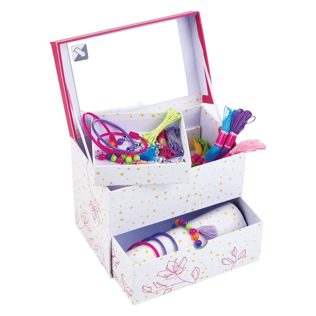 Crée à l'infini tes bijoux préférés avec cette jolie boîte et ses nombreux accessoires ! Tu pourras ranger tes créations à l'intérieur et te contempler devant son miroir intégré.