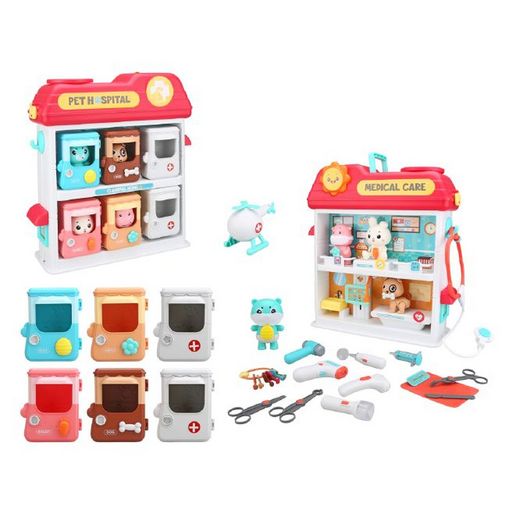 Le jeu comprend 4 figurines d'animaux, 6 petites chambres et une variété d'outils et d'accessoires de médecin, dont plusieurs sont dotés d'une fonction lumineuse et sonore.