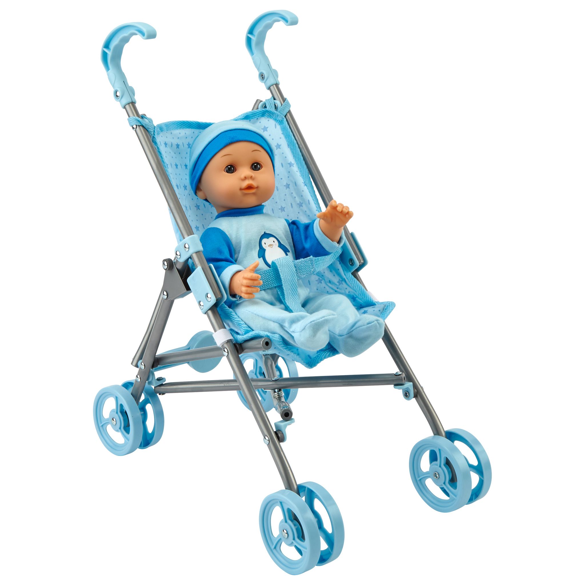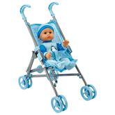 Poupon 35 cm avec poussette bleue