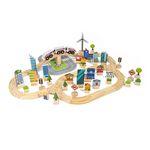 Le circuit est composé de 4 voies droites en bois, 1 voie de jonction en bois, 13 voies en courbe en bois, 2 voies de pont en courbe en bois, 1 pile de pont en bois, 2 voies de double jonction en bois, 26 accessoires de ville et d'espaces verts sur 26 bases en bois, 1 carton A4 avec décoration routière, 1 personnage en bois, 4 panneaux de signalisation en bois.