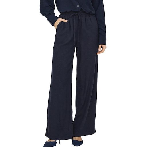 Optez pour ce pantalon Only Coloris : MarineTaille élastiqueCordon de serrageComposition : 55% lin, 45% viscoseCoupe régulièreTaille hauteJambe largeTaille élastique avec cordelette de serrage