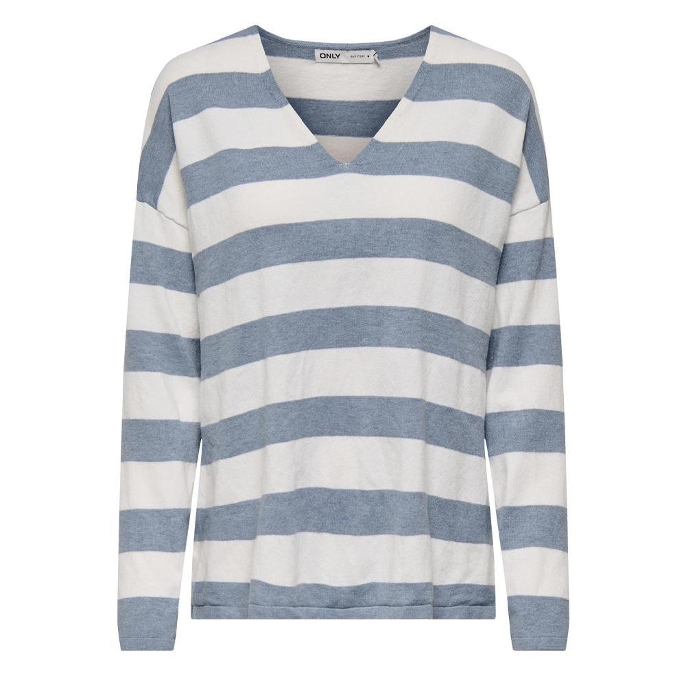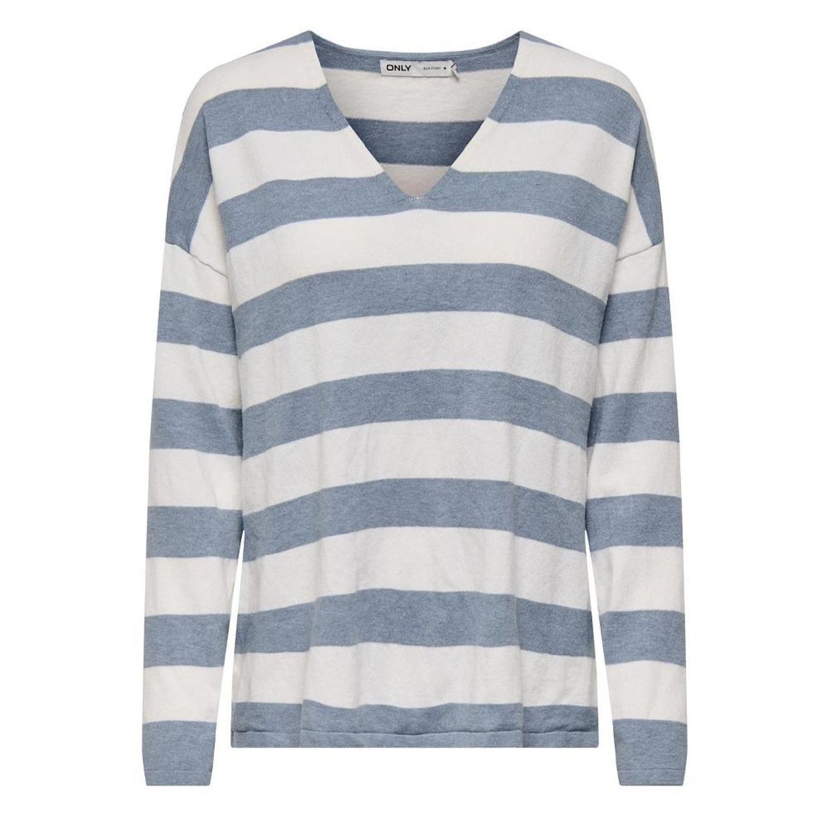 Craquez pour le pull femme de la marque Only !Manches longuesCol VColoris : Bleu/BlancMaille fineComposition : 69% polyester recyclé , 31% polyester