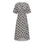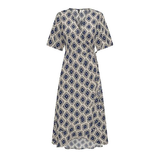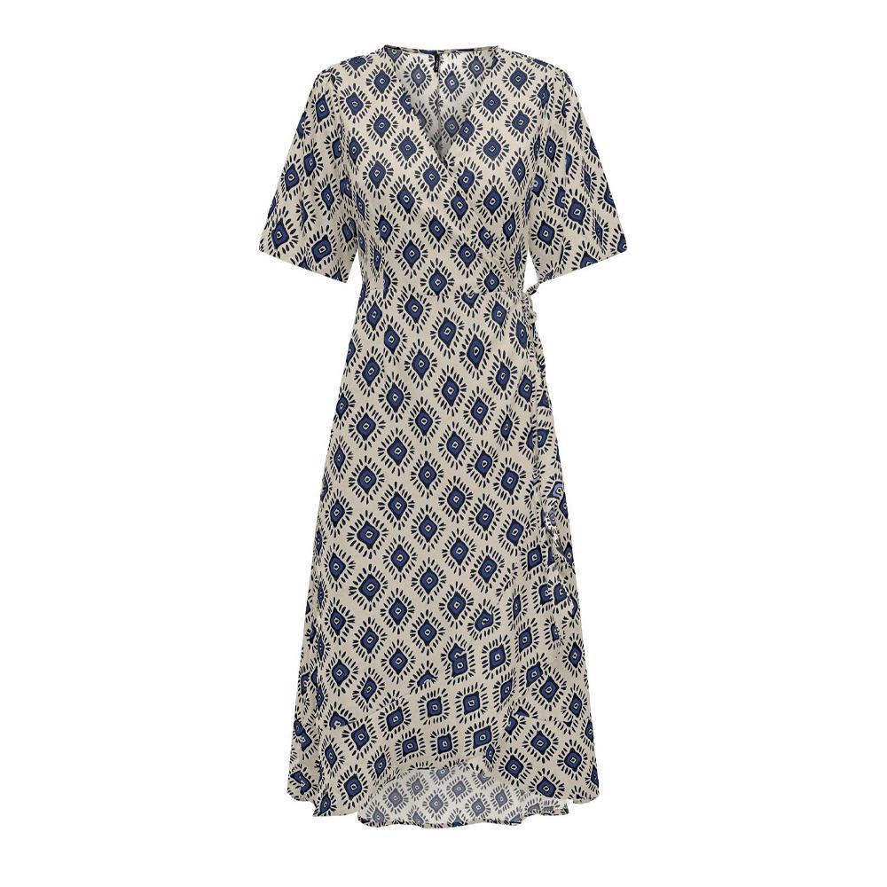 Craquez pour cette robe de la marque Only ! Coloris : Bleu/Blanc/NoirManches courtes avec élastiqueNoeud sur le côtéRobe portefeuilleCol VComposition : 100% viscose